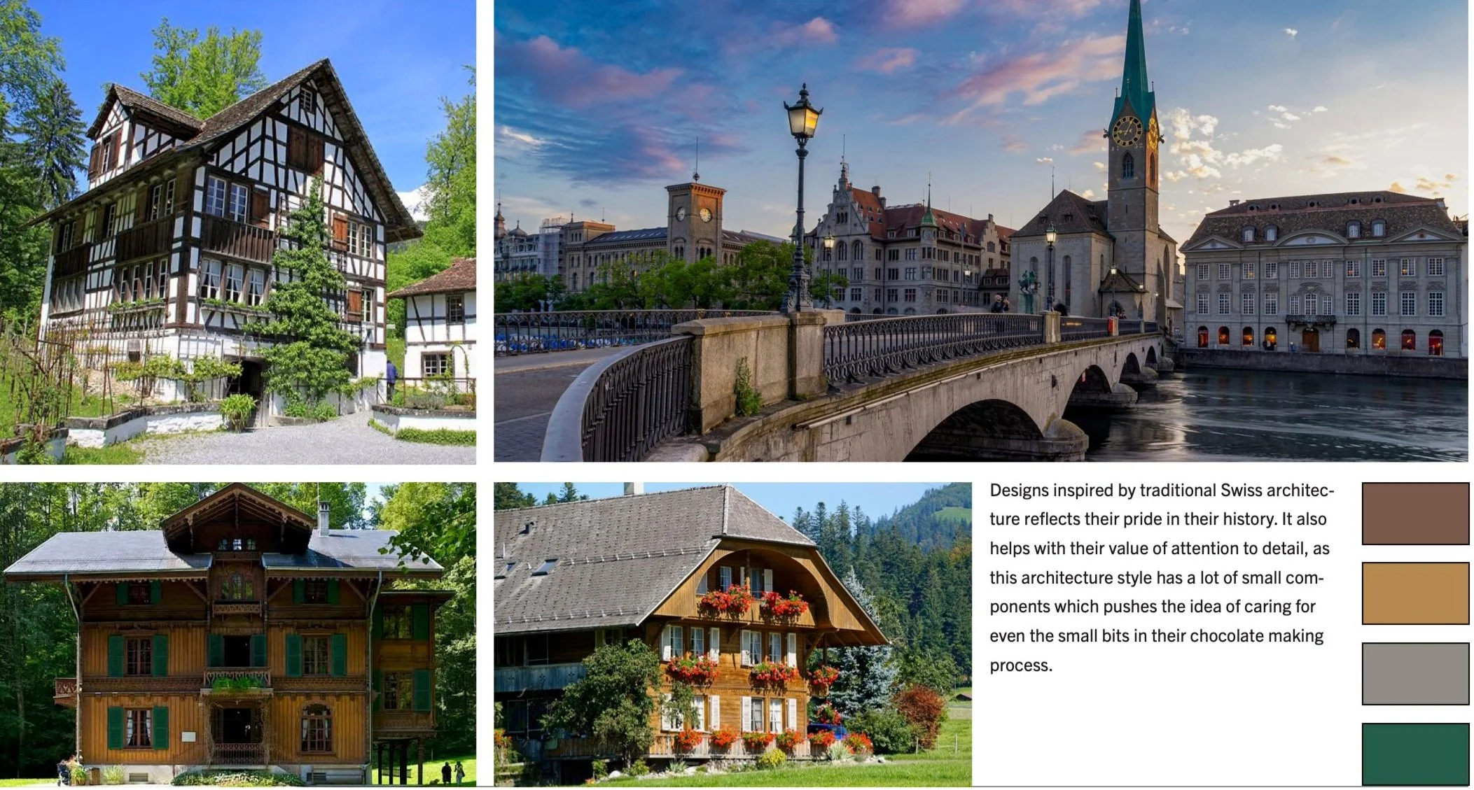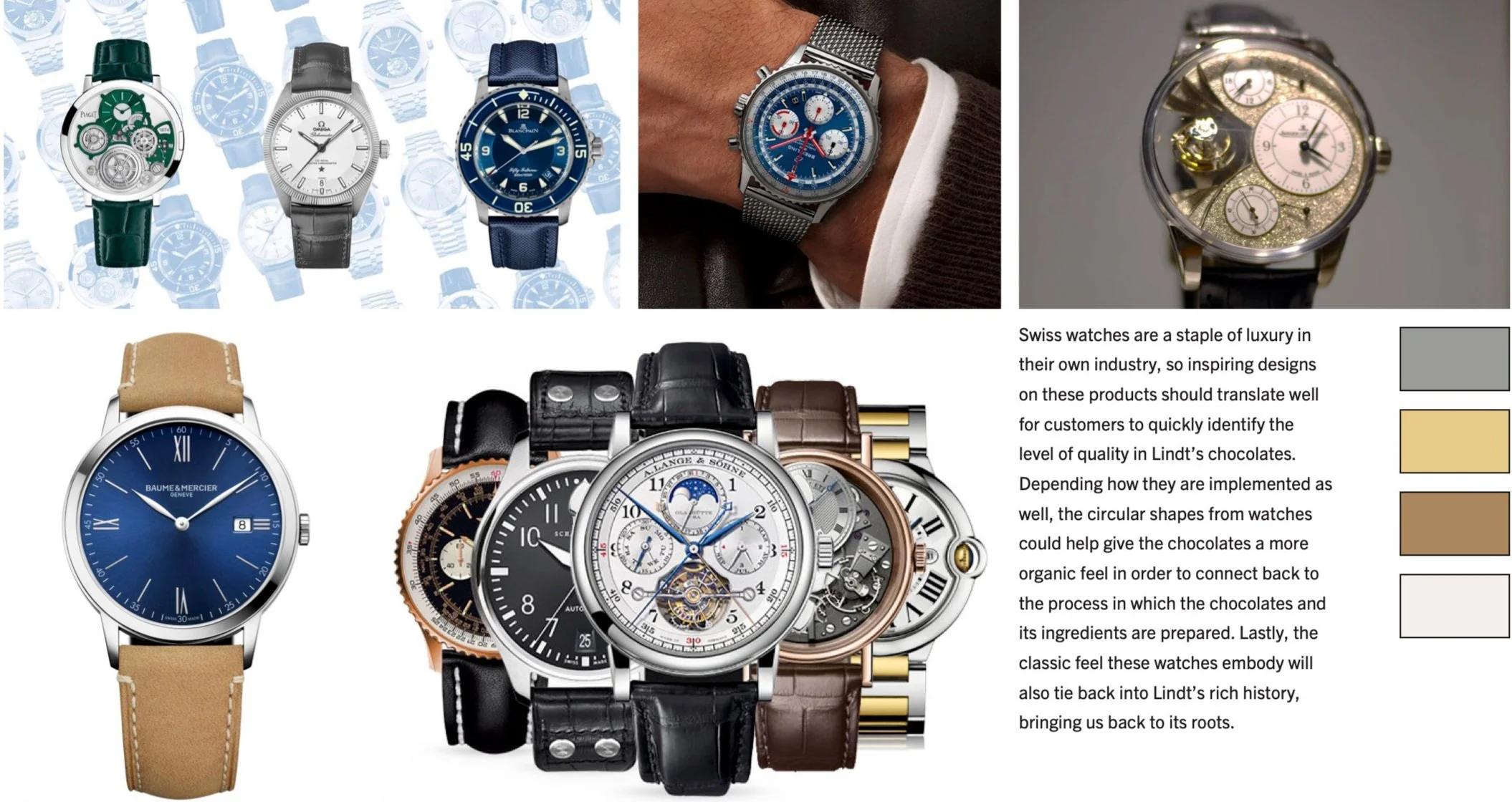 The idea behind my line of chocolates was looking back at the Swiss roots of Lindt, so I looked at old Swiss architecture, landscapes, and modern watches.